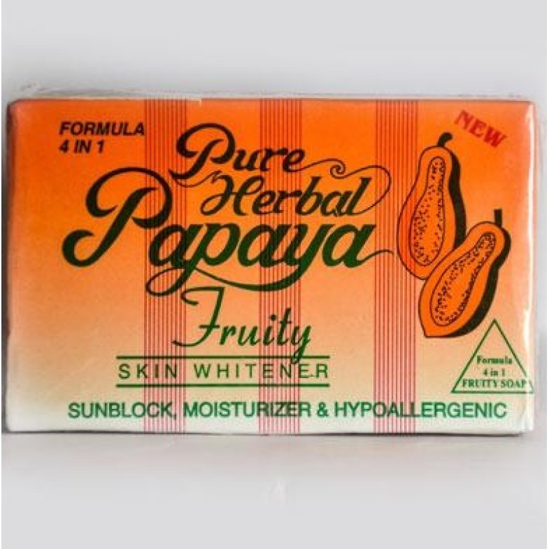 Pure Herbal Papaya Fruity Soap is a 4in1 soap. The herbal papaya cubes whitens the skin with its papaya extract. The clear, transparent soap is hypoallergenic for sensitive skin use. It has also has glycerine for moisturizing and added with sunscreen for sun protection